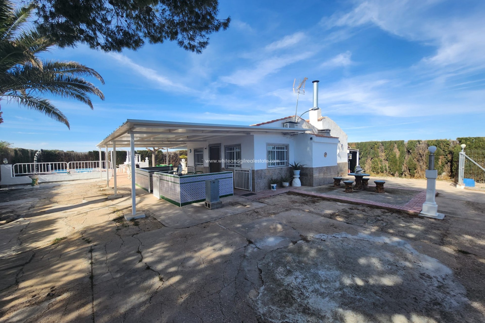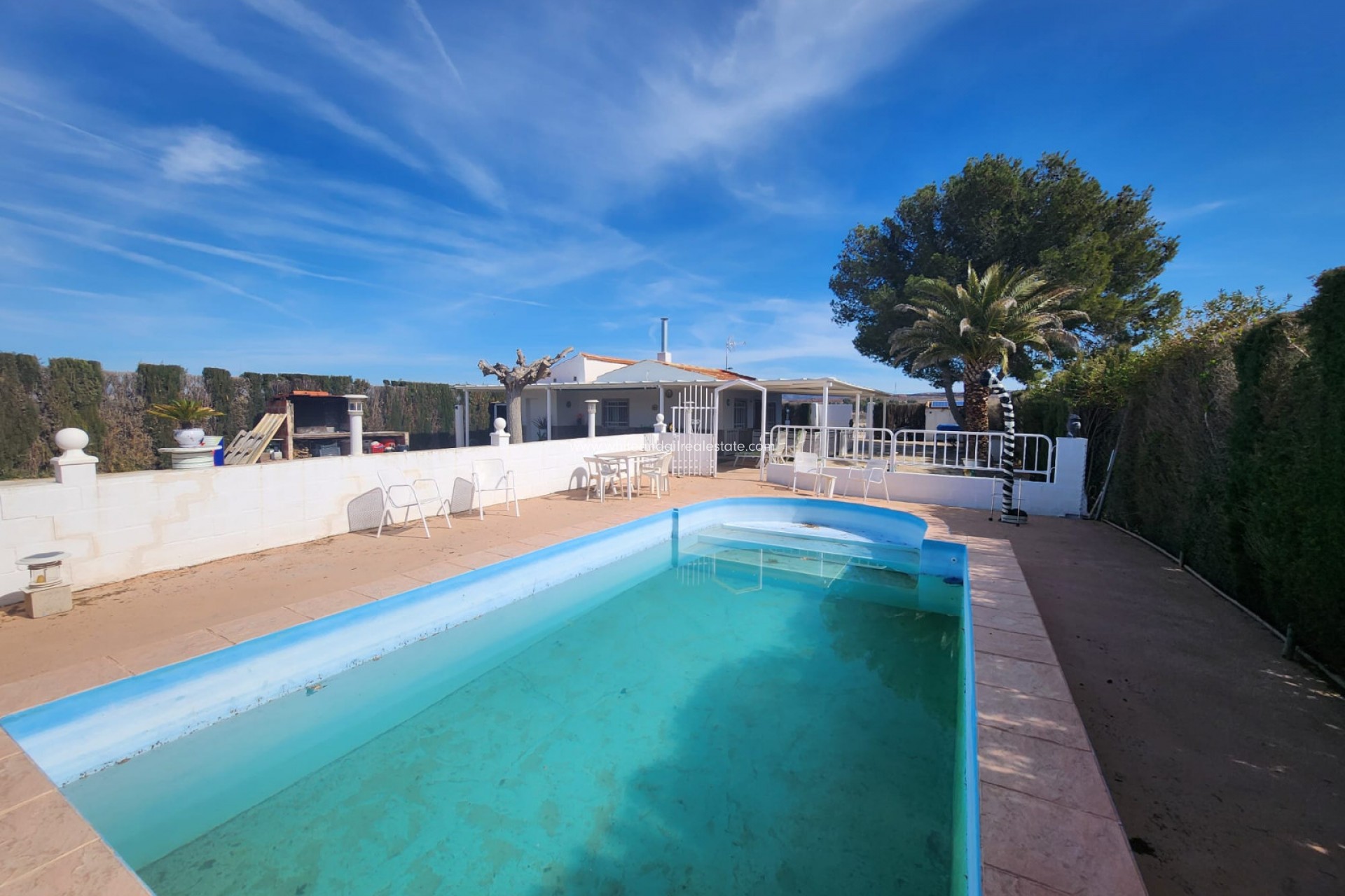 Nous sommes fiers de proposer cette charmante villa espagnole située dans la campagne à l'extérieur de Villena, avec 2 chambres, 1 salle de bain principale et un WC extérieur pour les clients utilisant la piscine, etc.