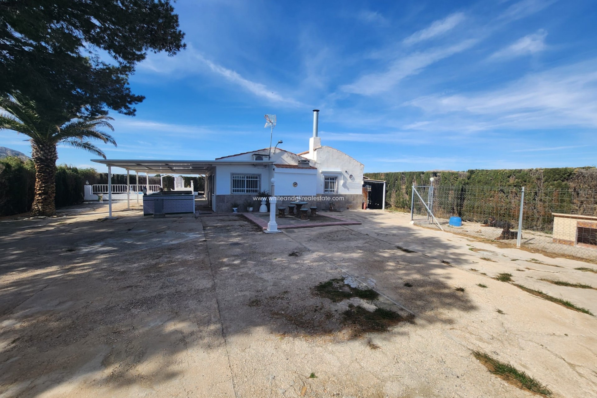 En entrant par la route de gravier, vous êtes accueilli par une longue allée menant au parking principal (port de voiture) et un grand portail menant à la maison. Ceci est entièrement clôturé, donc idéal si vous avez des chiens, etc., et comprend un chenil clôturé, un autre chenil, une salle de stockage solaire, une maison principale avec WC extérieur et une piscine de 7 x 4 m avec marches romaines. À l'arrière de la propriété se trouve une grande zone, actuellement aménagée en parcours de BMX/Motor cross, mais elle pourrait être aménagée en jardin assez facilement, si nécessaire.